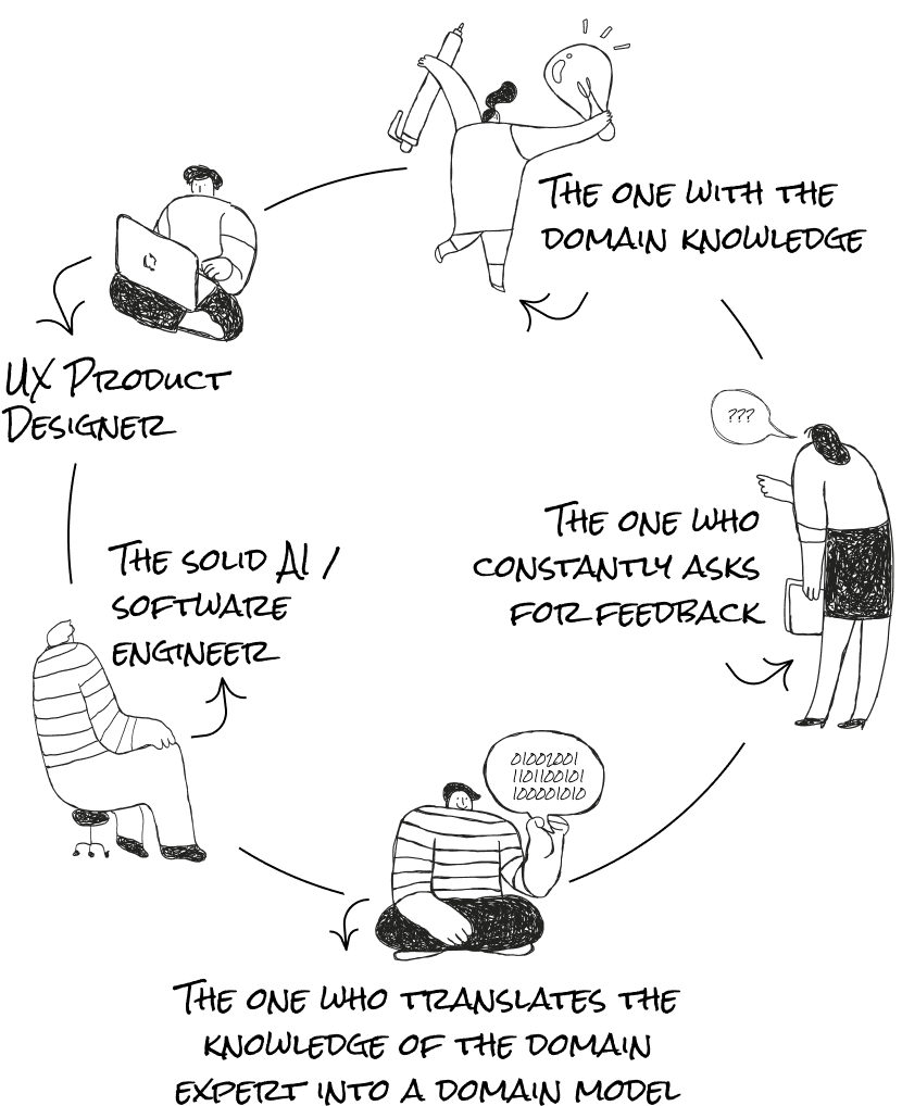 Die Entwicklung guter KI-Assistenten für Unternehmen setzt ein Team voraus, in dem unterschiedliche Fachkräfte effektiv zusammenarbeiten. Es bedarf nicht nur Techniker:innen, sondern ebenso Fachexpert:innen, Kommunikator:innen, Designer:innen und Strateg:innen.